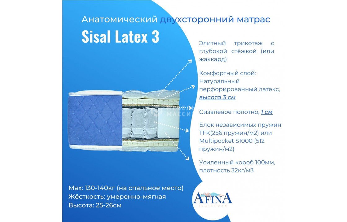 двусторонний Sisal Latex 3 / Sisal Memory 4 от фабрики афина с пружинным блоком tfk-256 (256 пружин на кв. метр) или multi-512 (512 пружин на кв. метр) на выбор. чехол жаккард стёганный 180-220 гр/м2 или элитный трикотаж с объёмной стёжкой 300гр/м2 на выбор. купите по цене производителя в интернет-магазине мебель массив.| Размер | Цена | |